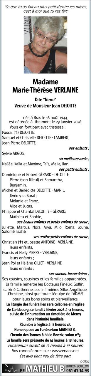 Décédée à Libramont (6800, Belgique) le jeudi 29 janvier 2026 à l'âge de 81 ans