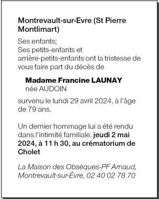 AVIS OBSEQUES MME LAUNAY FRANCINE NEE AUDOIN