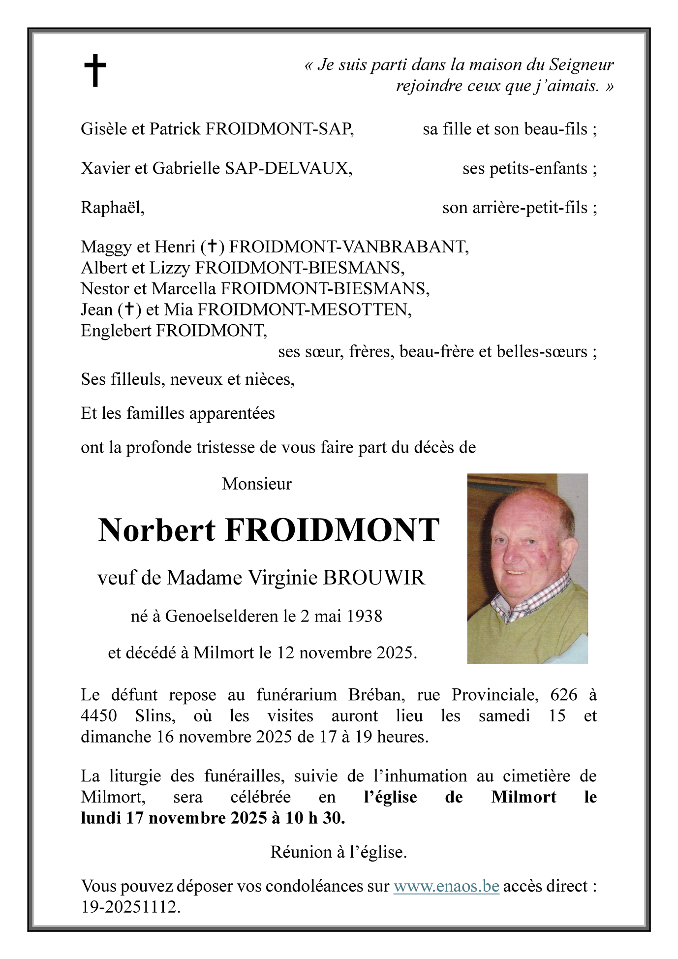 Monsieur Norbert FROIDMONT veuf de Virginie BROUWIR