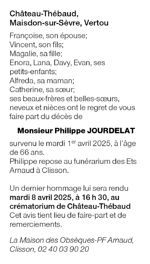 | Monsieur Philippe JOURDELATDomiciliado en Château-Thébaud (44690) Nacido en Troyes (10000) el sábado, 13 de diciembre de 1958 Fallecido en Château-Thébaud (44690) el martes, 1 de abril de 2025 a la edad de 66 años Esposo de Madame Françoise JOURDELAT