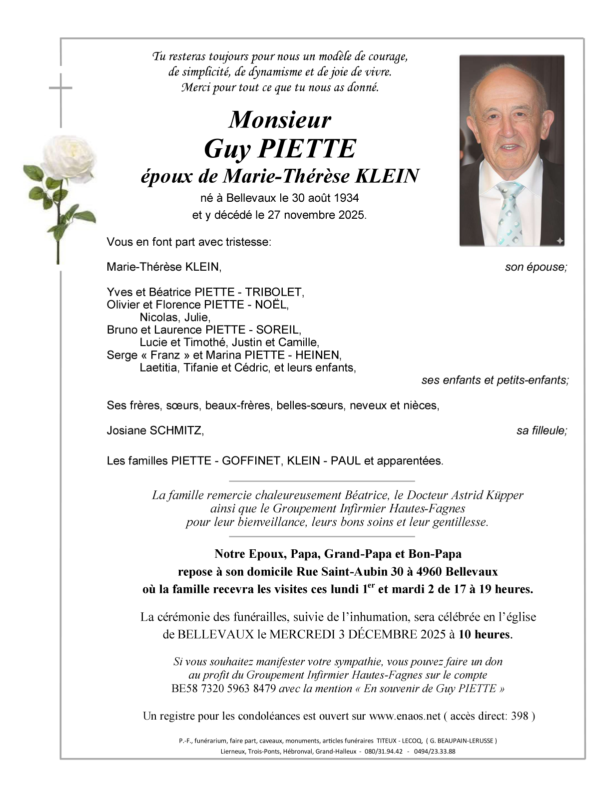 Décédé à Bellevaux-Ligneuville (4960, Belgique) le jeudi 27 novembre 2025 à l'âge de 91 ans