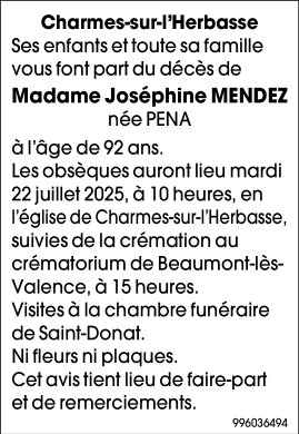 Décédée à Romans-sur-Isère (26100) le dimanche 13 juillet 2025 à l'âge de 92 ans