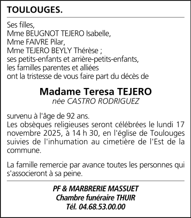 Décédée à Toulouges (66350) le jeudi 13 novembre 2025 à l'âge de 92 ans