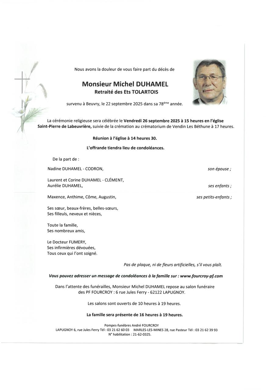 Décédé à Beuvry (62660) le lundi 22 septembre 2025 à l'âge de 77 ans