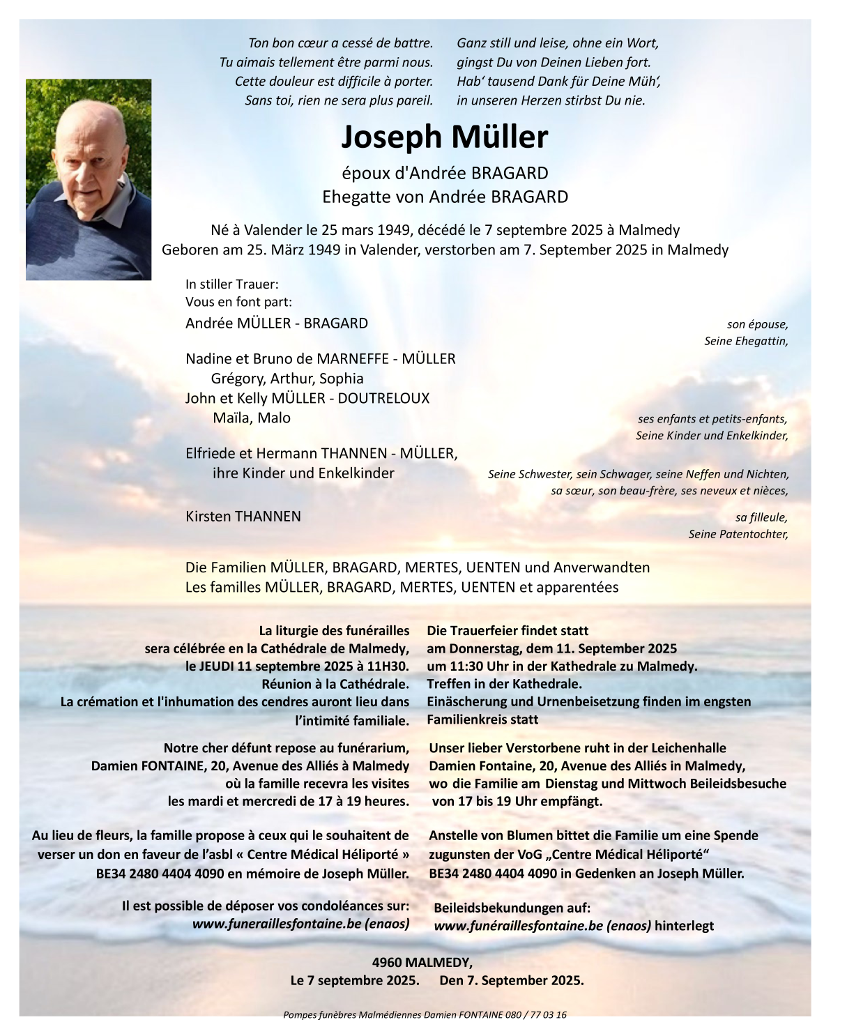 Overleden te Malmedy (4960, België) op zondag 7 september 2025 op 76-jarige leeftijd