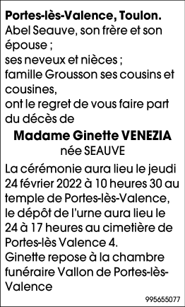 Décédée à Portes-lès-Valence (26800) le lundi 21 février 2022 à l'âge de 93 ans