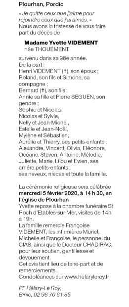Madame Yvette VIDEMENT née THOUÉMENT