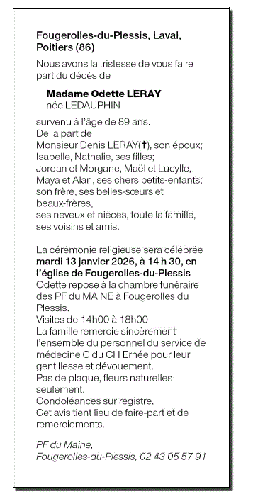 Annonce nécrologique de Madame Odette LERAY née LEDAUPHIN
