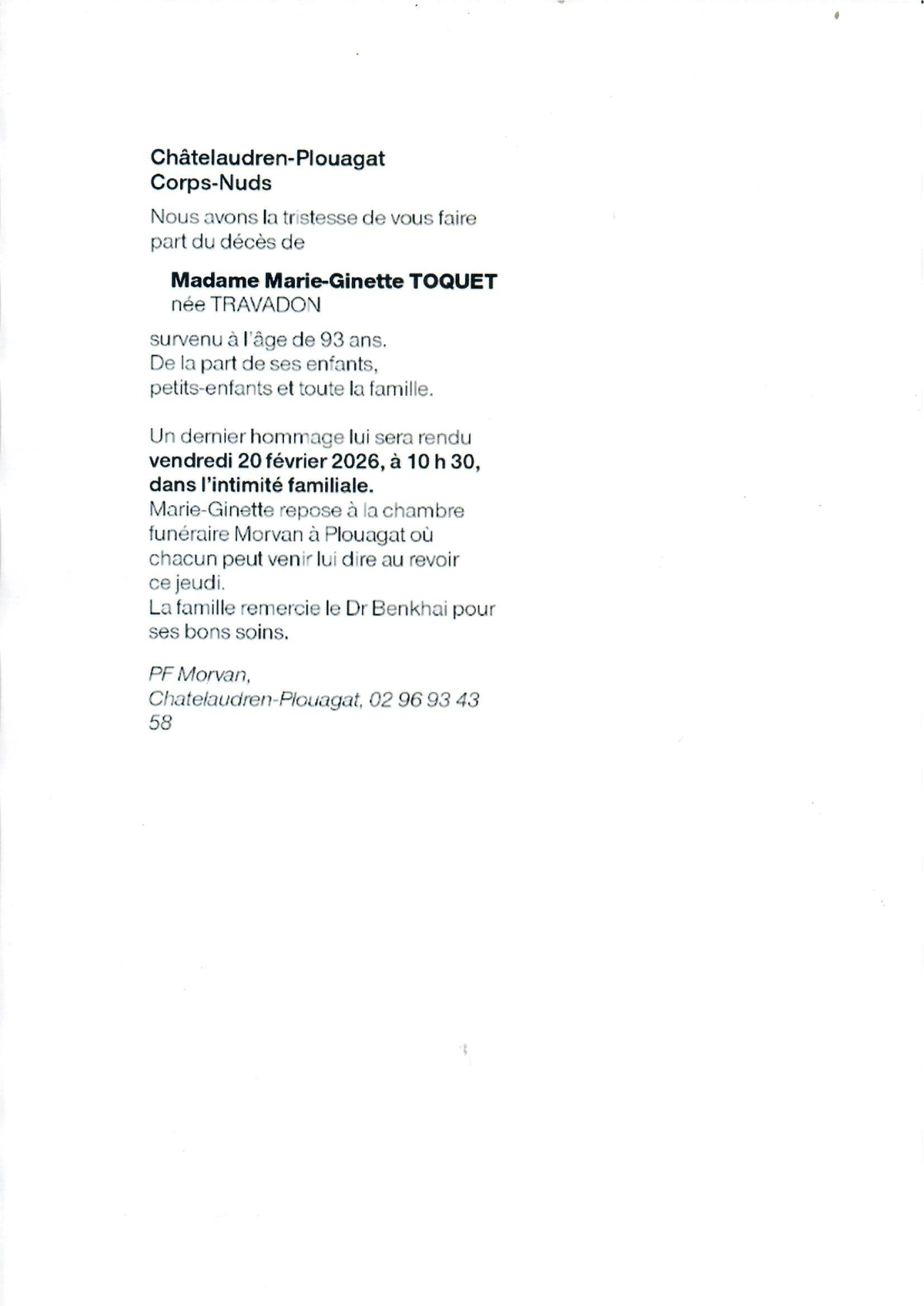 Décédée à Châtelaudren-Plouagat (22170) le mardi 17 février 2026 à l'âge de 93 ans