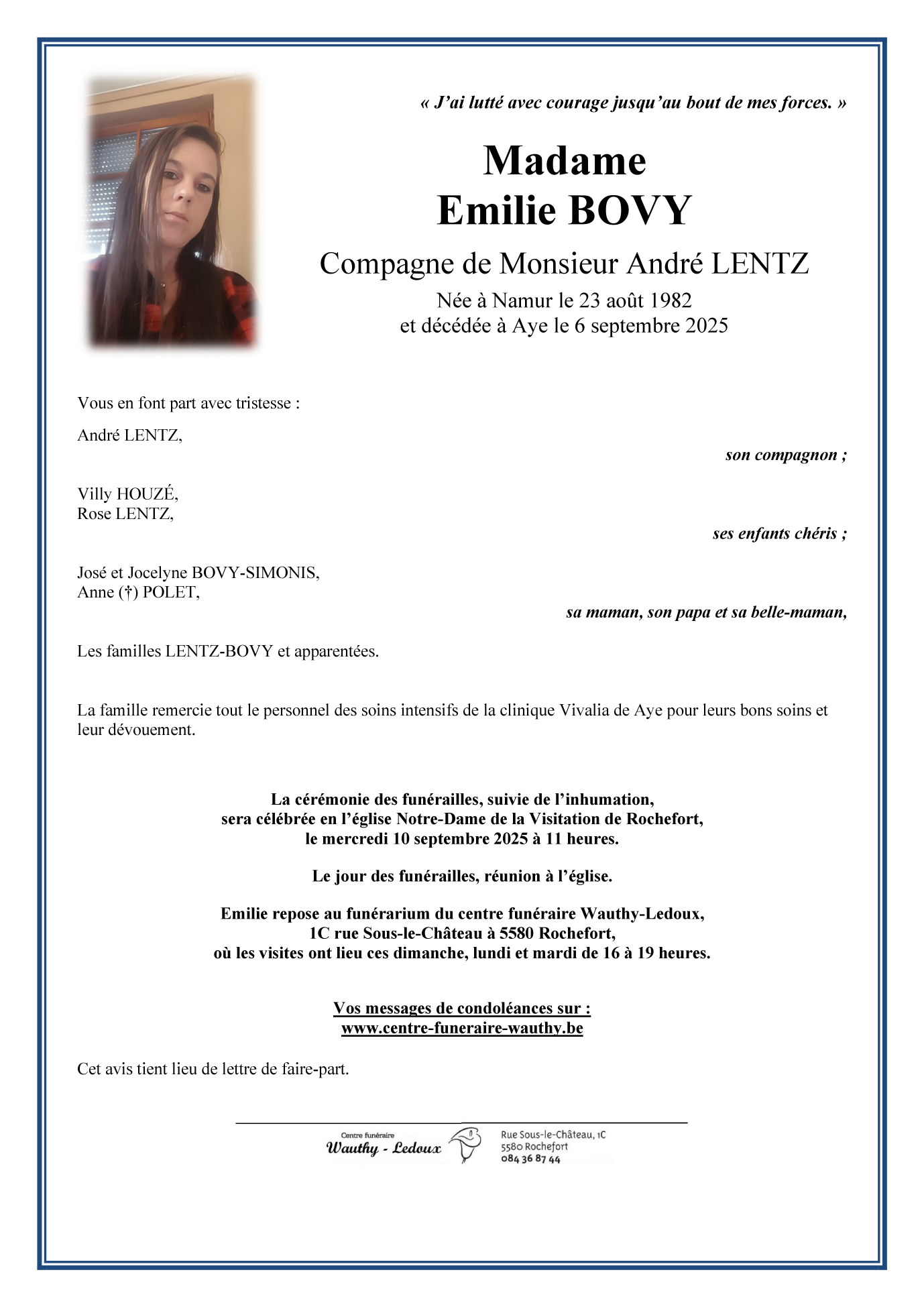 Décédée à Aye (6900, Belgique) le samedi 6 septembre 2025 à l'âge de 43 ans