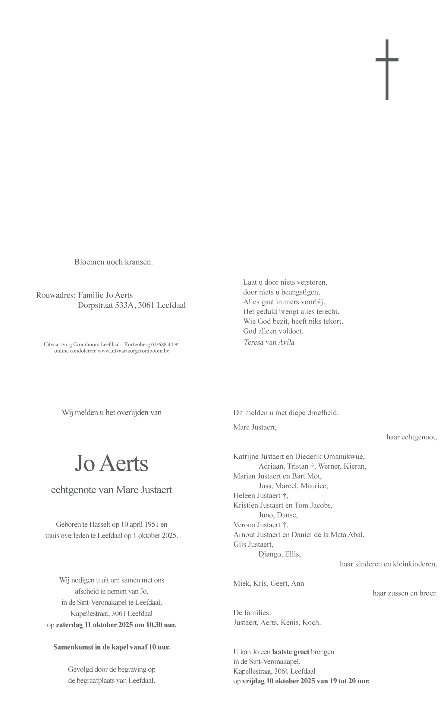 Décédée à Leefdaal (3061, Belgique) le mercredi 1 octobre 2025 à l'âge de 74 ans
