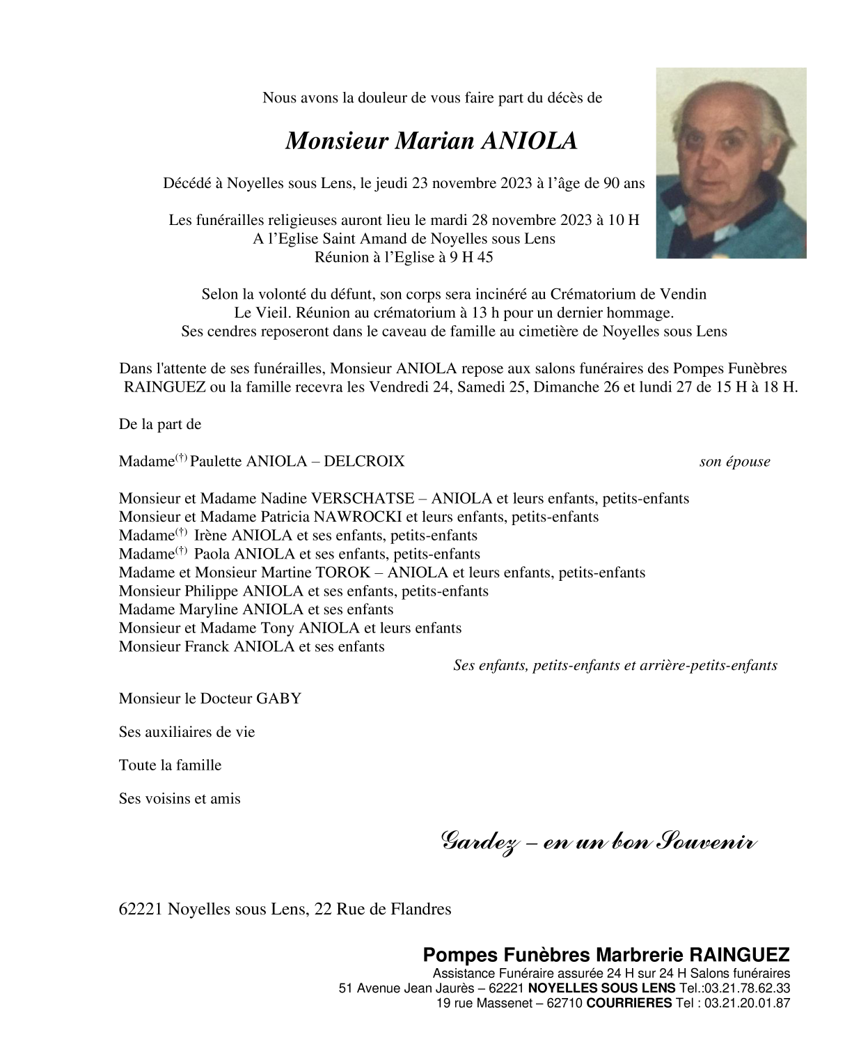 Décédé à Noyelles-sous-Lens (62221) le jeudi 23 novembre 2023 à l'âge de 90 ans