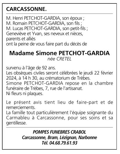 Madame Simone PETCHOT-GARDIA née CRETEL