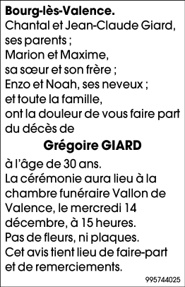 Died in Bourg-lès-Valence (26500) on 03 December 2022 at the age of 30 years