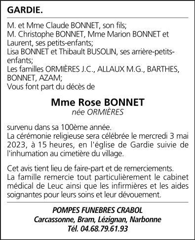 Décédée à Gardie (11250) le dimanche 30 avril 2023 à l'âge de 99 ans