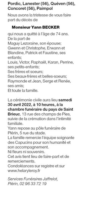 Décédé à Saint-Brieuc (22000) le dimanche 24 avril 2022 à l'âge de 74 ans