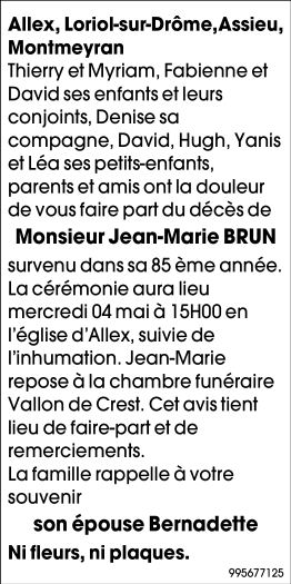 Overleden te Valence (26000) op vrijdag 29 april 2022 op 84-jarige leeftijd