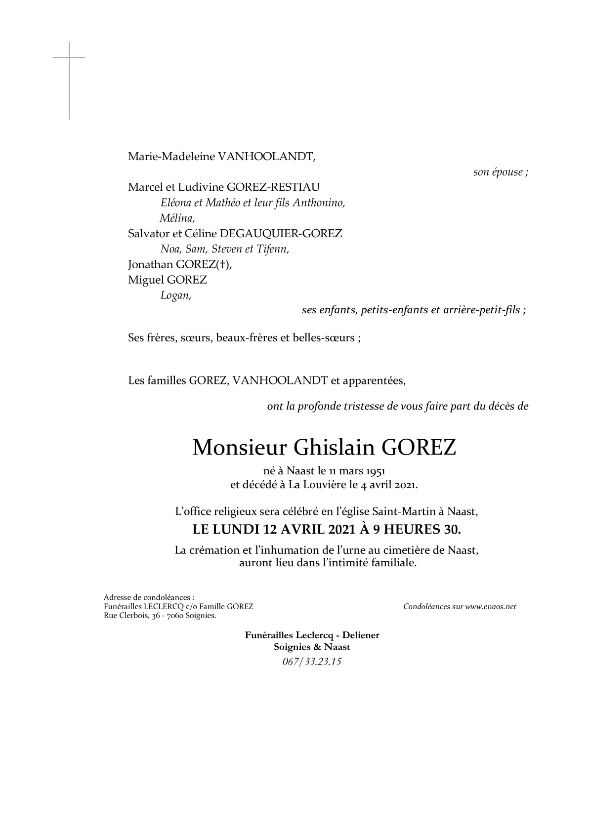 Décédé à Haine-Saint-Paul (7100, Belgique) le dimanche 4 avril 2021 à l'âge de 70 ans