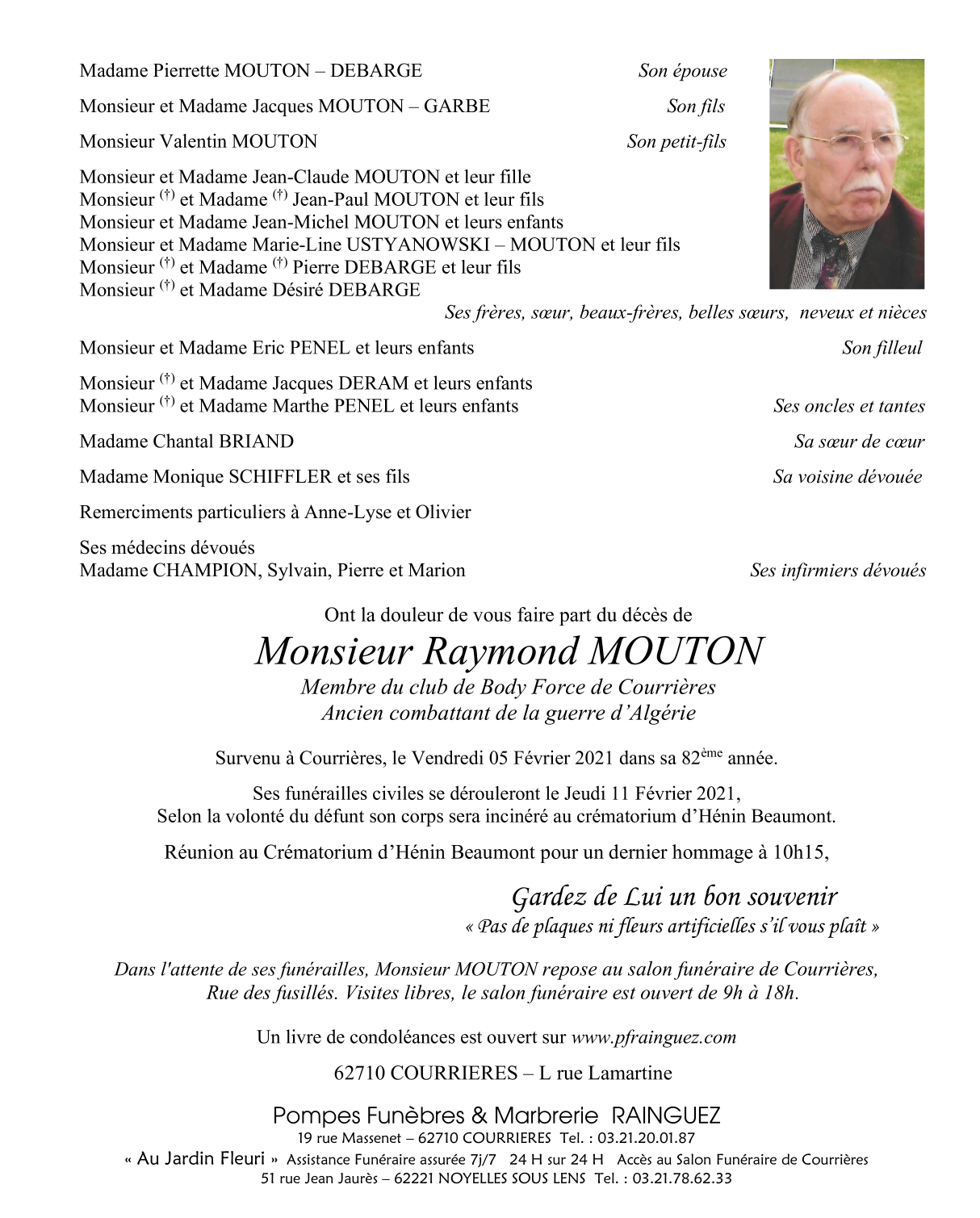 Décédé à Courrières (62710) le vendredi 5 février 2021 à l'âge de 81 ans