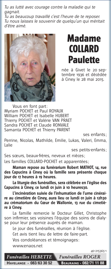 Died in Ciney (5590, Belgium) on 28 May 2015 at the age of 78 years