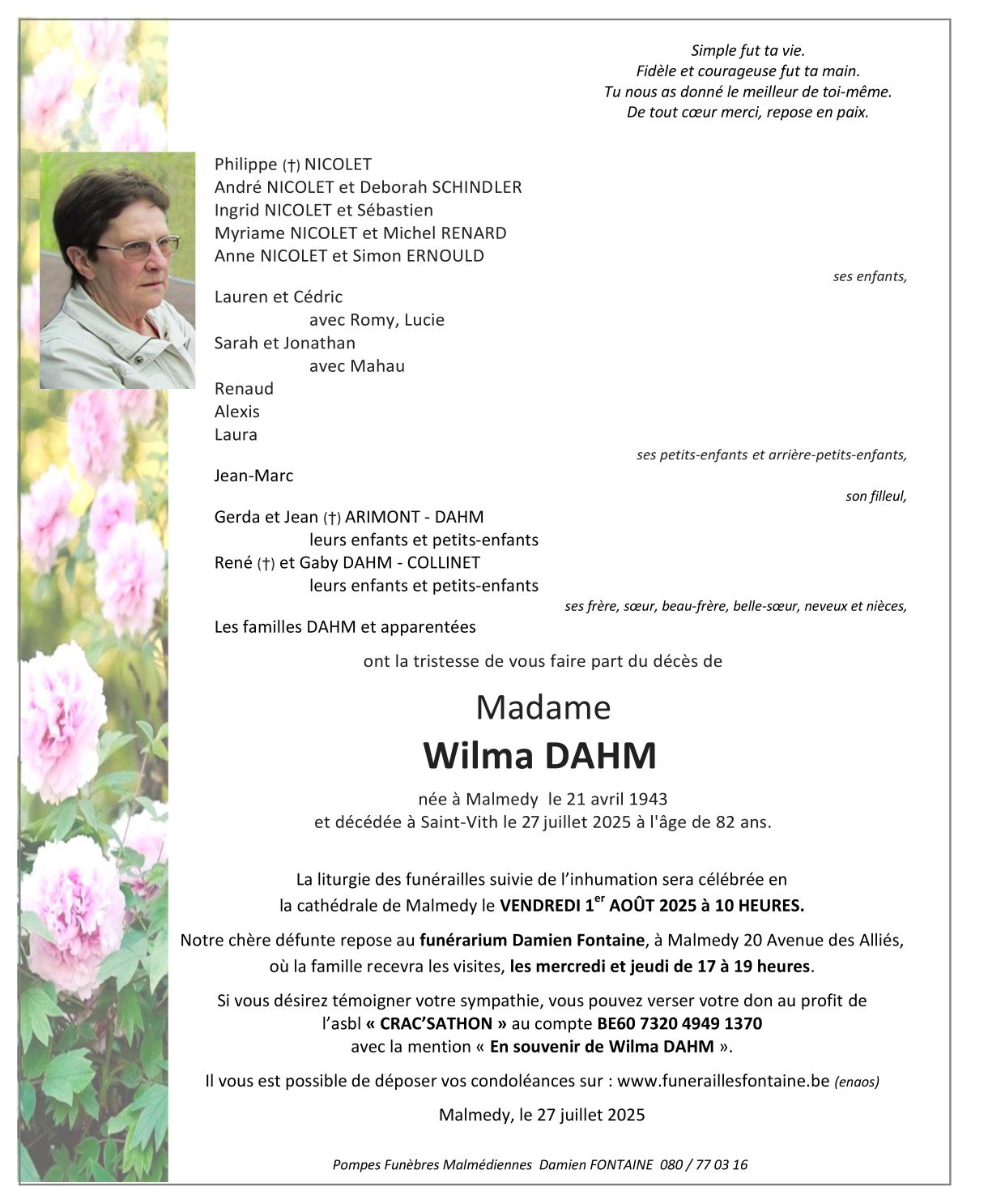Décédée à Saint-Vith (4780, Belgique) le dimanche 27 juillet 2025 à l'âge de 82 ans