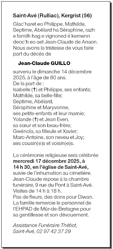 Died in Mur de Bretagne (22530) on 14 December 2025 at the age of 80 years