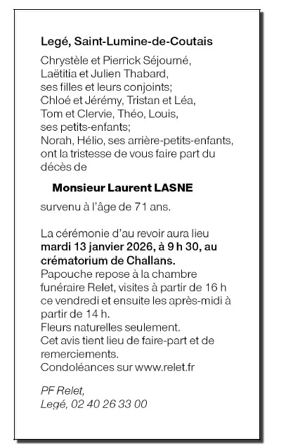 Décédé à Legé (44650) le jeudi 8 janvier 2026 à l'âge de 71 ans