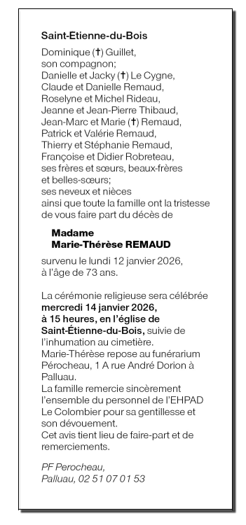 Décédée à Saint-Étienne-du-Bois (85670) le lundi 12 janvier 2026 à l'âge de 73 ans