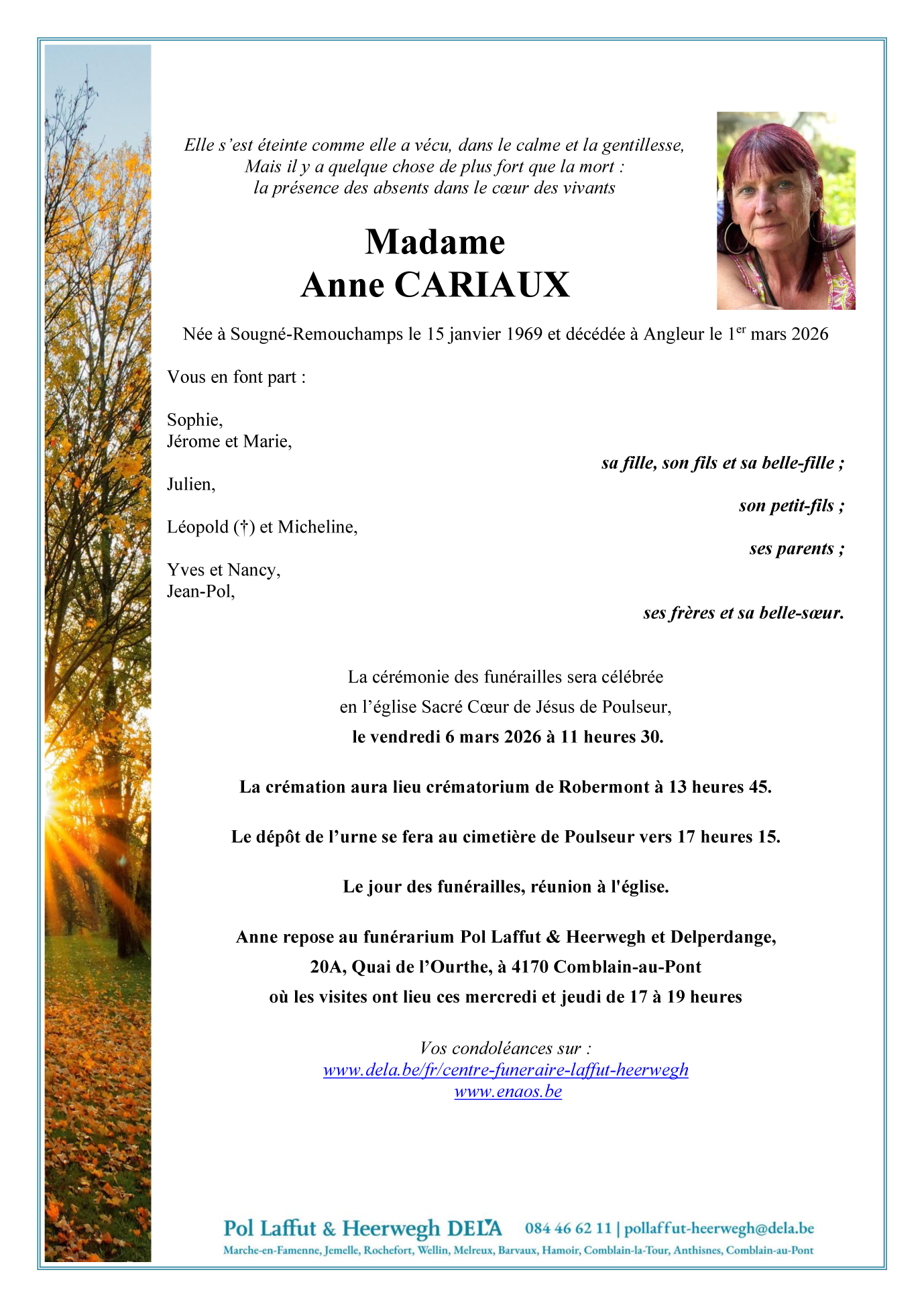 Née à Sougné-Remouchamps (4920, Belgique) le mercredi 15 janvier 1969