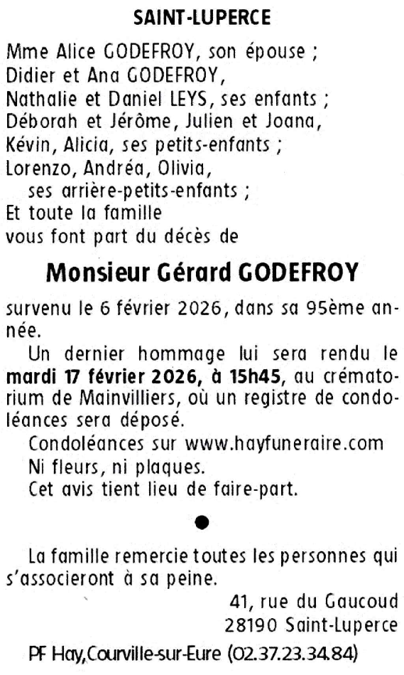 Décédé à Le Coudray (28630) le vendredi 6 février 2026 à l'âge de 94 ans