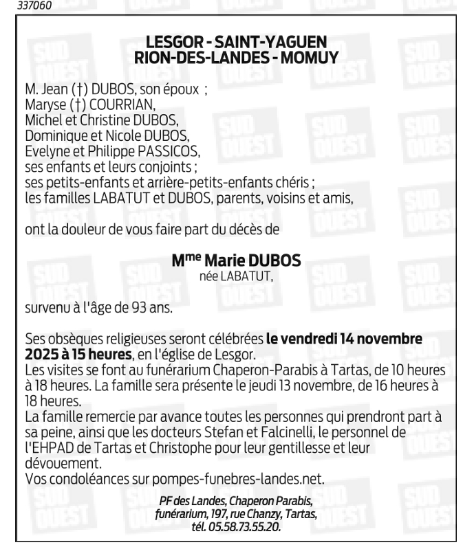 Overleden te Tartas (40400) op maandag 10 november 2025 op 93-jarige leeftijd