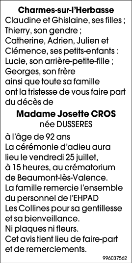 Died in Saint-Donat-sur-l'Herbasse (26260) on 20 July 2025 at the age of 92 years