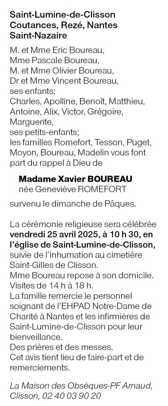 Décédée à Nantes (44000) le dimanche 20 avril 2025 à l'âge de 95 ans