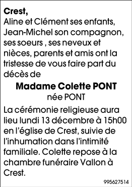 Décédée à Crest (26400) le mardi 7 décembre 2021 à l'âge de 58 ans