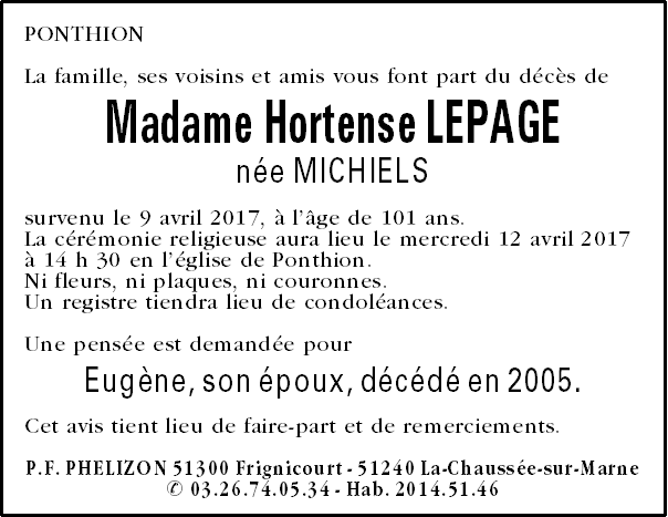 Madame Hortense LEPAGE née MICHIELS