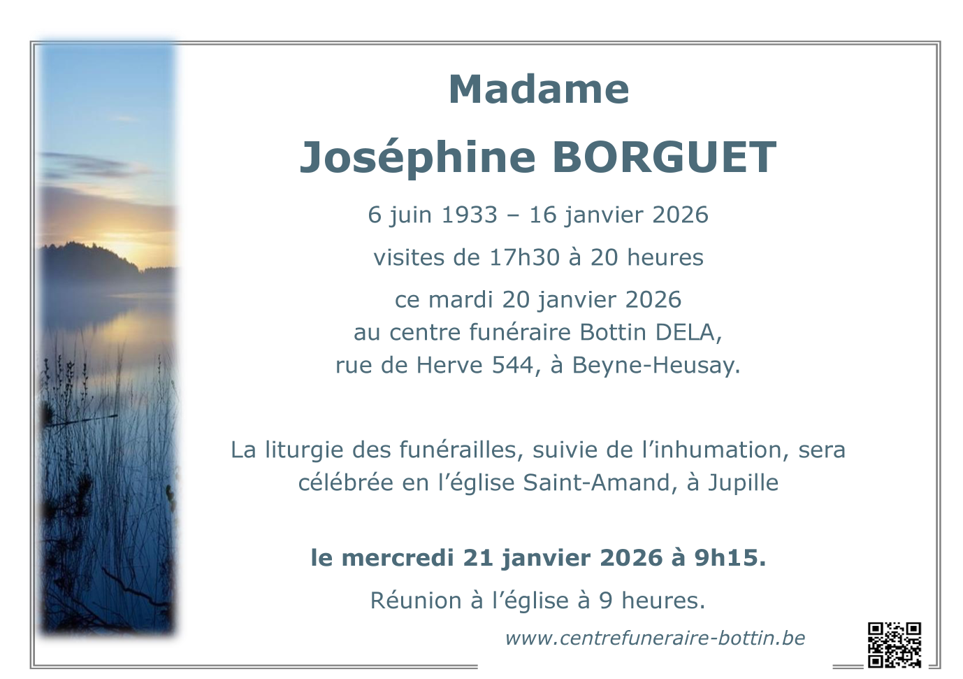 Décédée à Chênée (4032, Belgique) le vendredi 16 janvier 2026 à l'âge de 92 ans