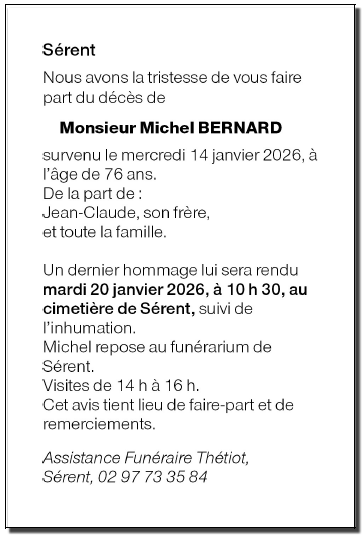 Décédé à Sérent (56460) le mercredi 14 janvier 2026 à l'âge de 76 ans