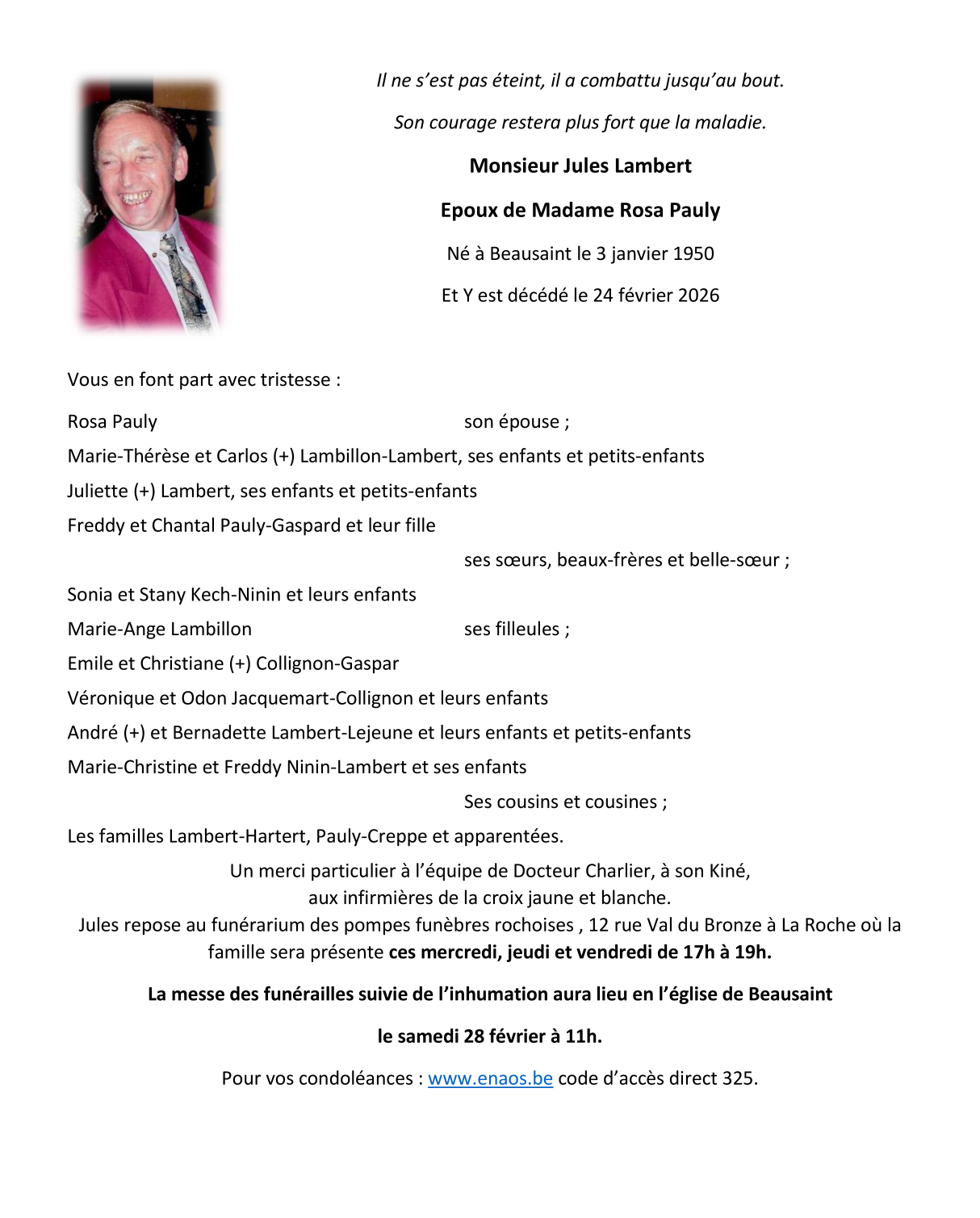 Fallecido en Beausaint (6980, Bélgica) el martes, 24 de febrero de 2026 a la edad de 76 años