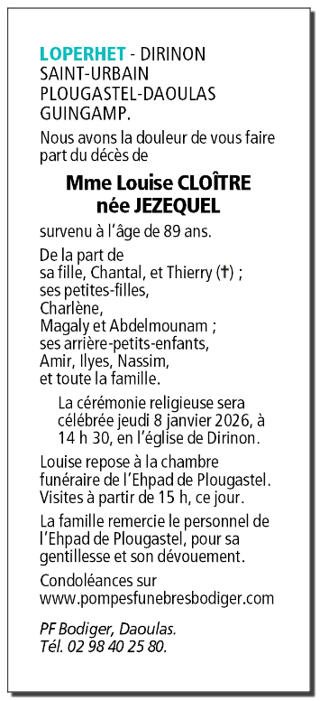 Died in Plougastel-Daoulas (29470) on 05 January 2026 at the age of 89 years