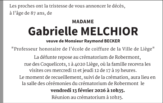 Décédée à Seraing (4100, Belgique) le lundi 9 février 2026 à l'âge de 87 ans