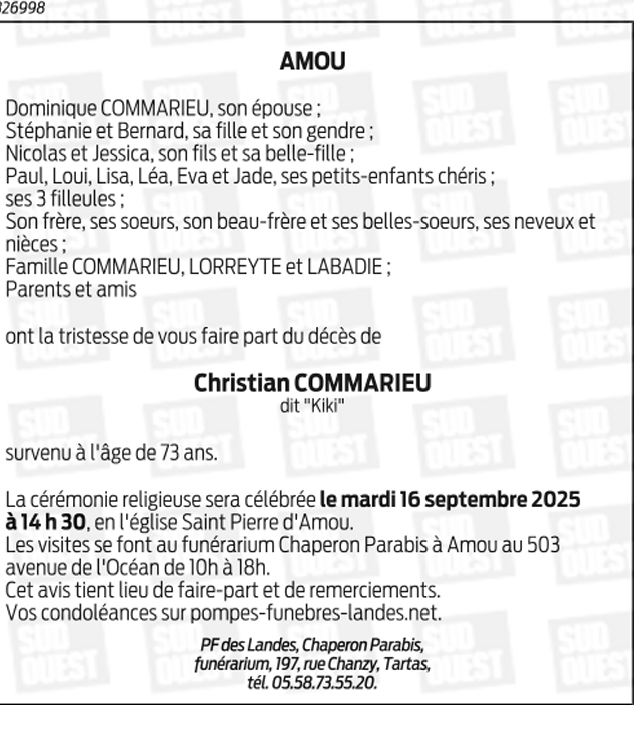 Overleden te Amou (40330) op vrijdag 12 september 2025 op 73-jarige leeftijd