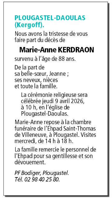 Overleden te Brest (29200) op zondag 5 april 2026 op 88-jarige leeftijd