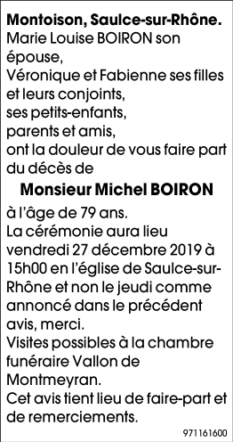 Décédé à Valence (26000) le lundi 23 décembre 2019 à l'âge de 79 ans