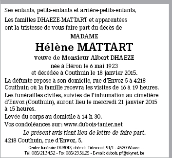 Décédée à Couthuin (4218, Belgique) le dimanche 18 janvier 2015 à l'âge de 91 ans