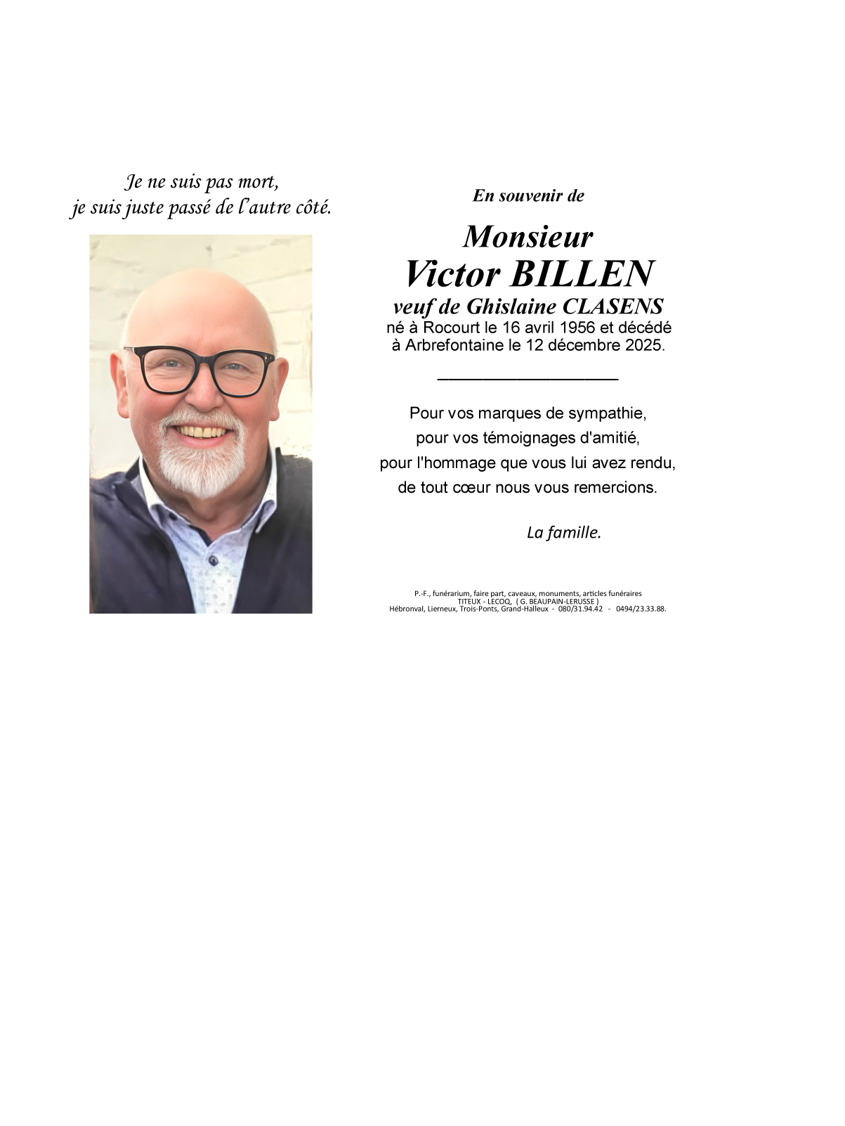 Décédé à Arbrefontaine (4990, Belgique) le vendredi 12 décembre 2025 à l'âge de 69 ans