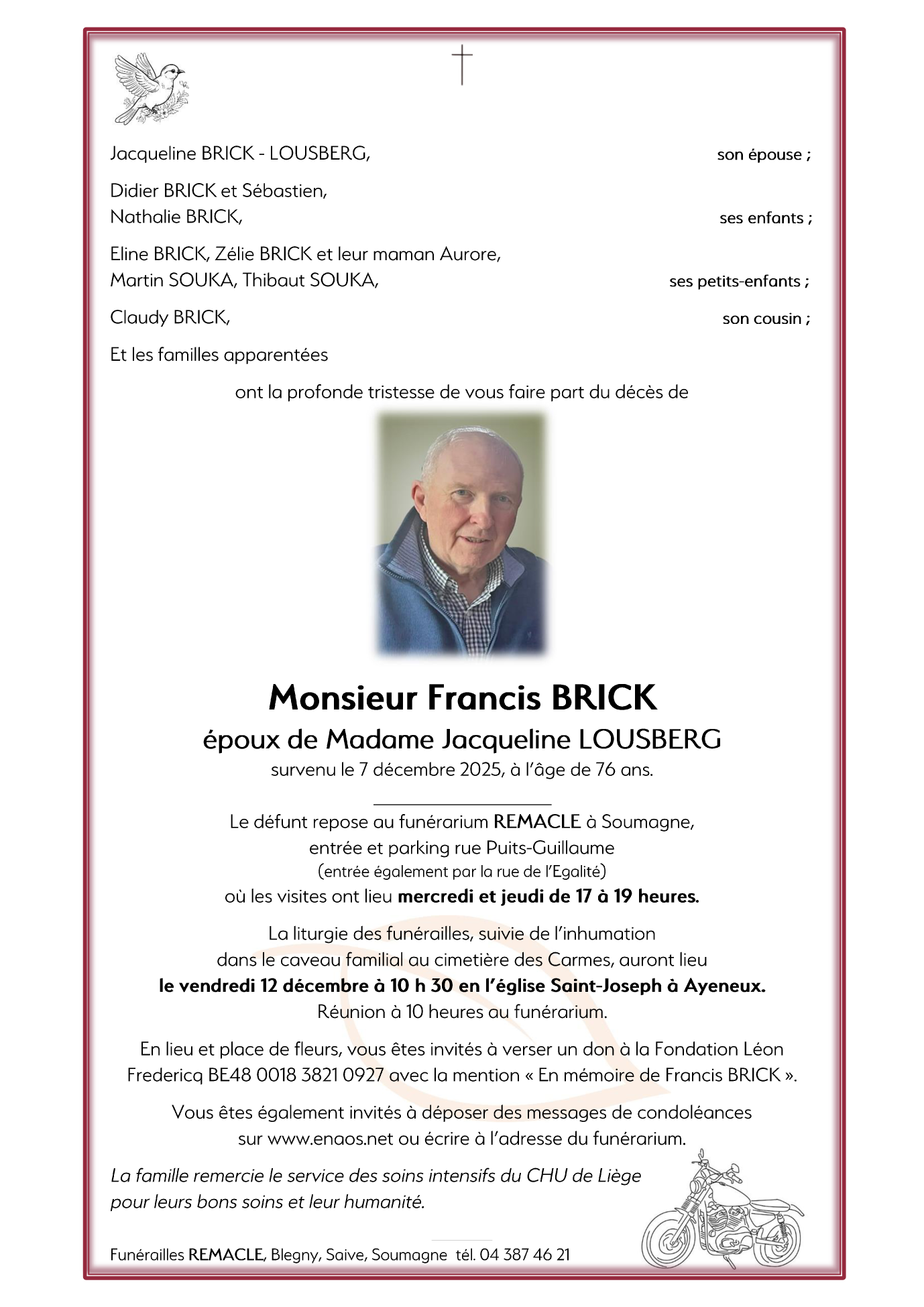Décédé à Liège (4000, Belgique) le dimanche 7 décembre 2025 à l'âge de 76 ans