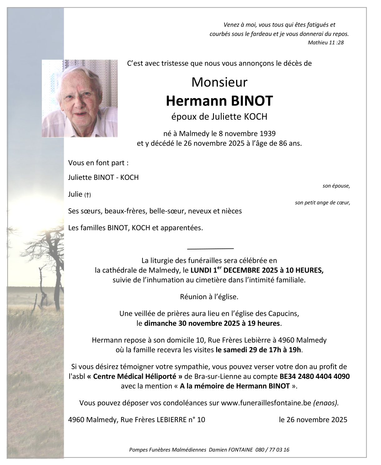 Décédé à Malmedy (4960, Belgique) le mercredi 26 novembre 2025 à l'âge de 86 ans
