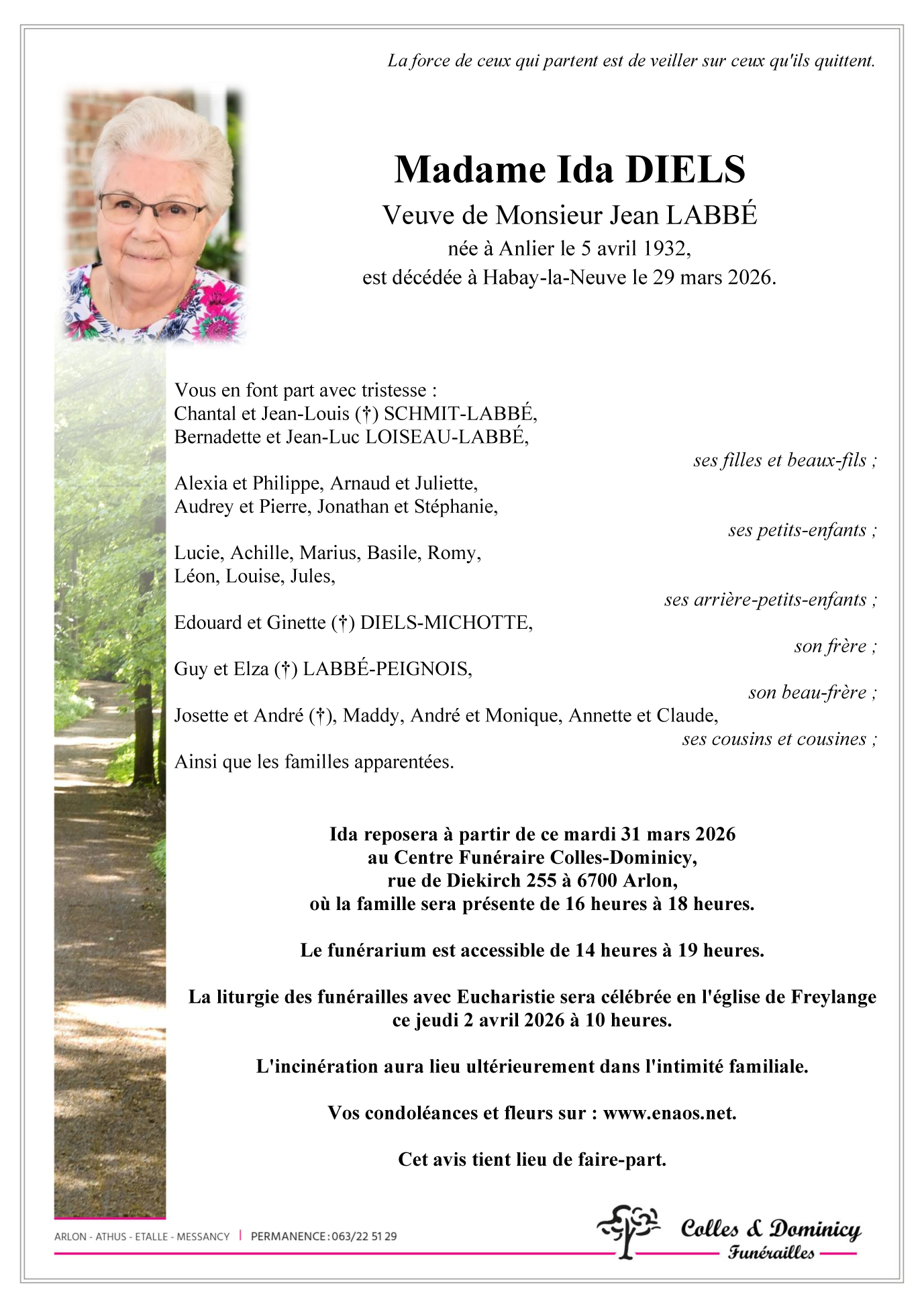 Décédée à Habay (6720, Belgique) le dimanche 29 mars 2026 à l'âge de 93 ans