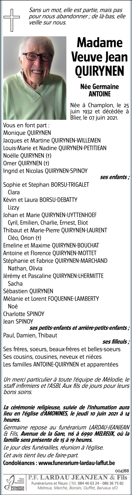 Died in Blier (6997, Belgium) on 07 June 2021 at the age of 88 years