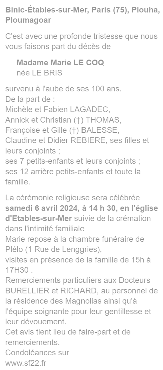 Overleden te Binic-Étables-sur-Mer (22680) op maandag 1 april 2024 op 99-jarige leeftijd